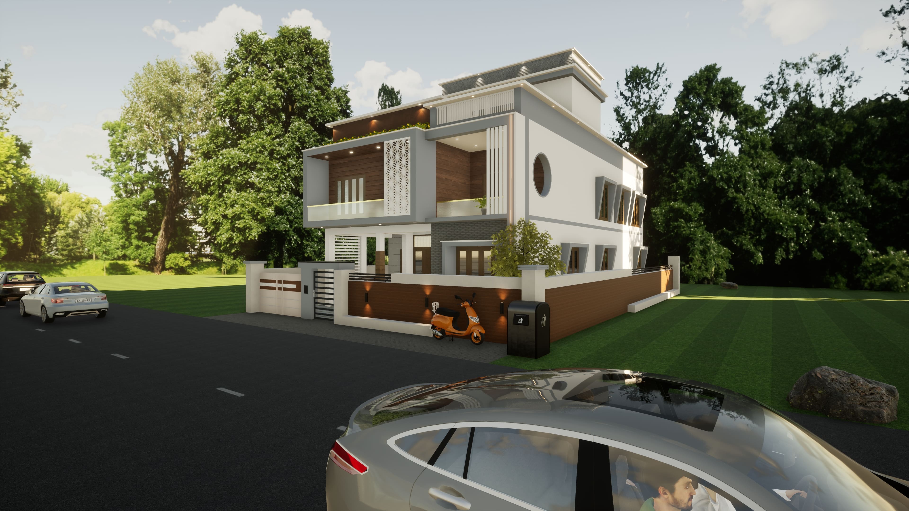 A high-end 3D visualization of a luxury exterior space, focusing on architectural elegance, façade detailing, and landscape integration. The design highlights premium materials, balanced lighting, and spatial harmony to create a strong visual identity. This render captures how structure, texture, and outdoor elements work together to deliver a refined and modern exterior experience.