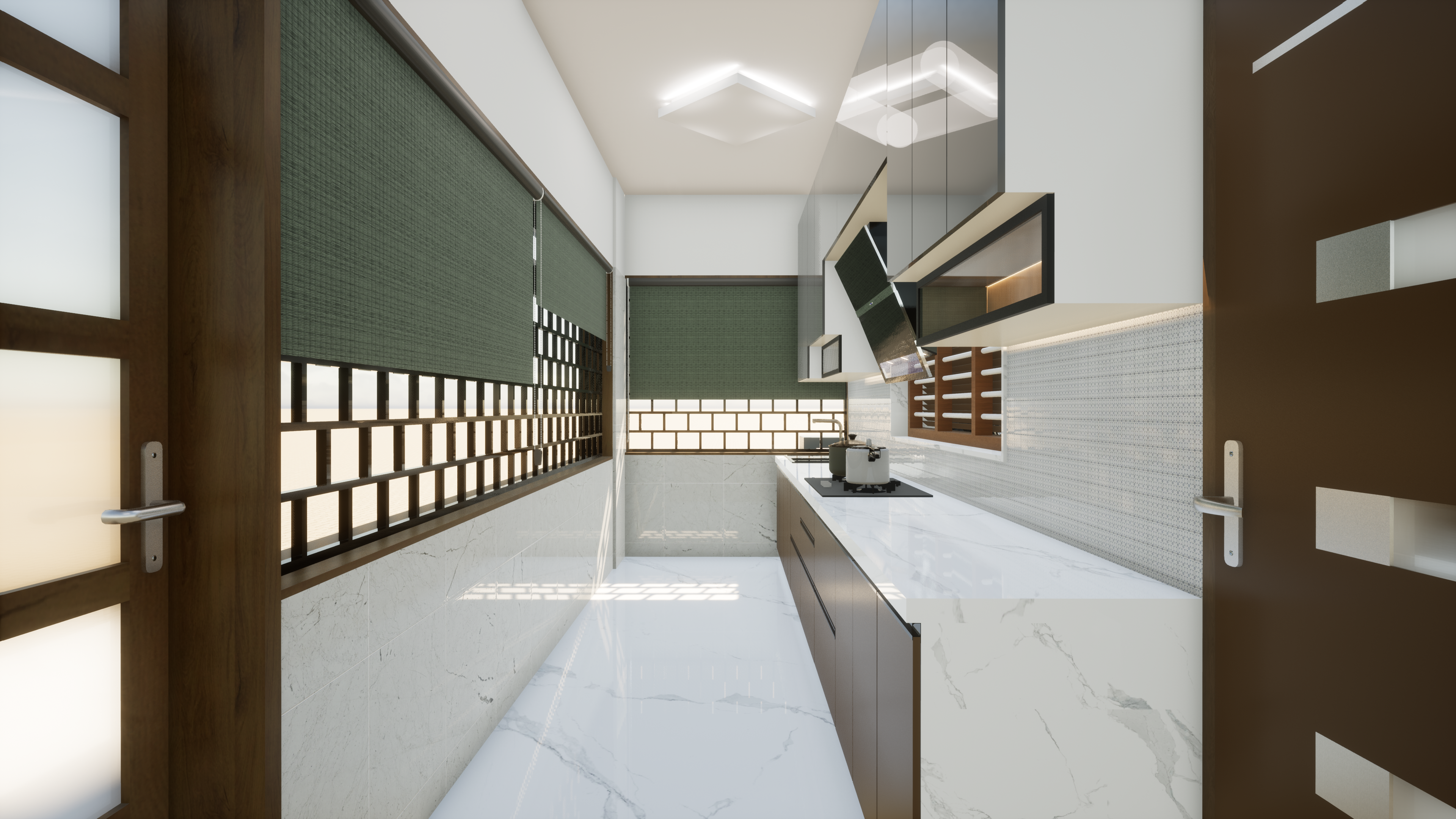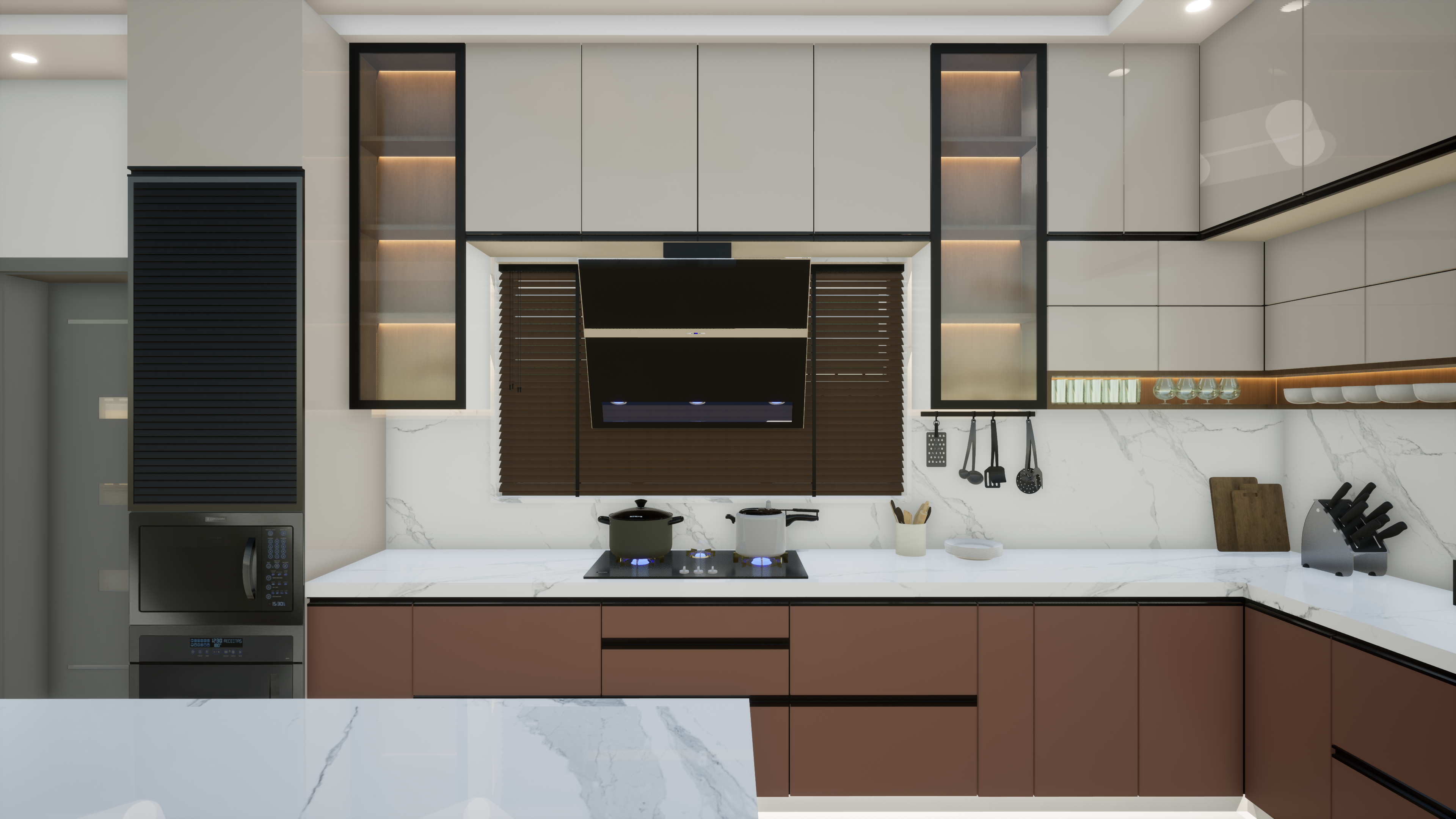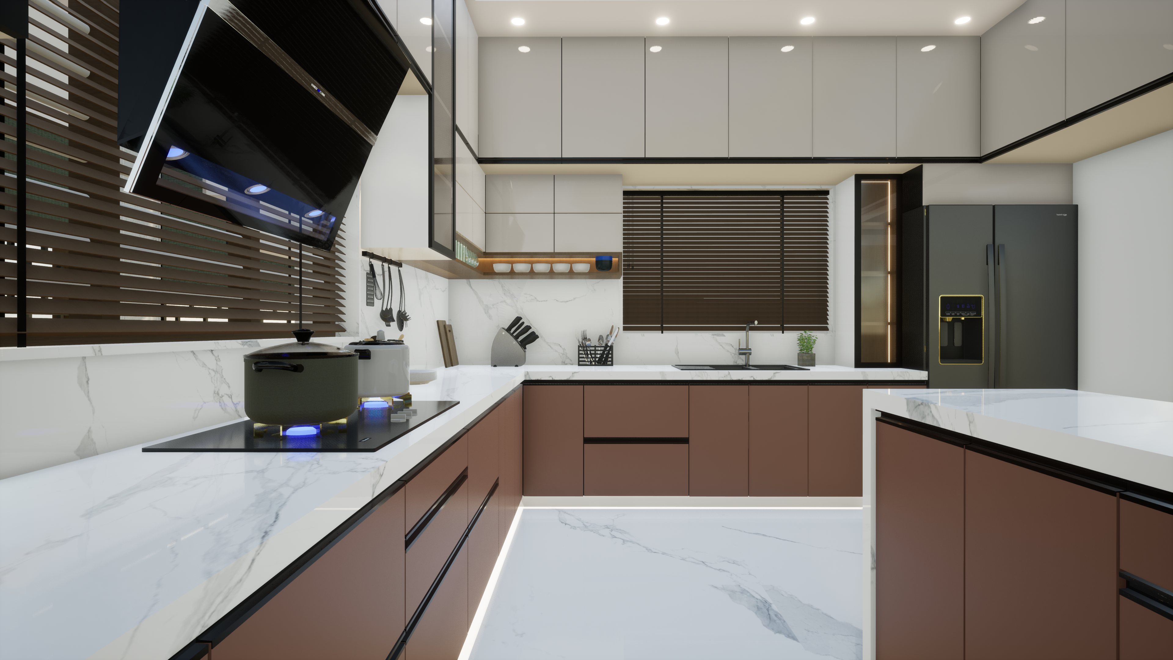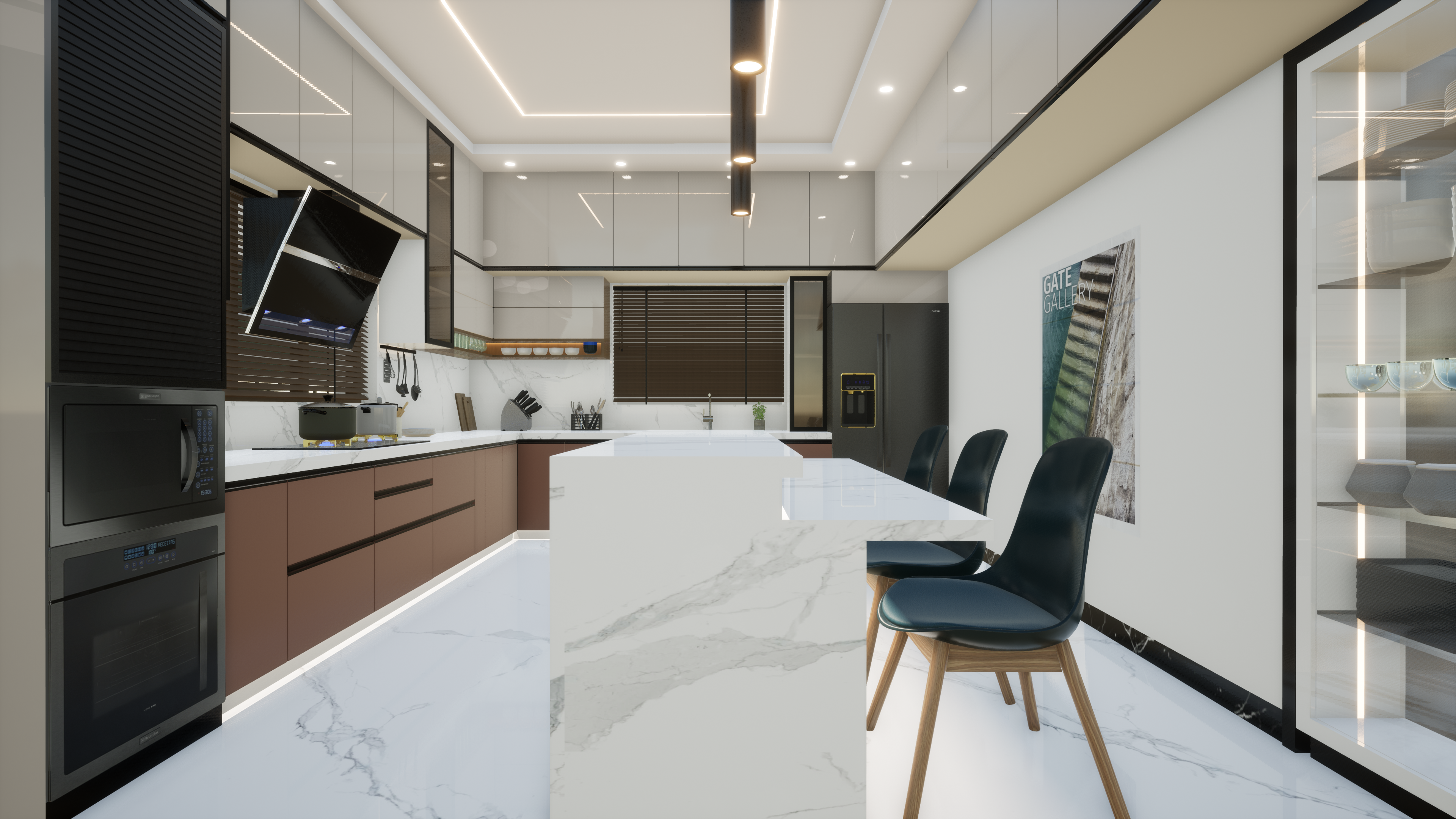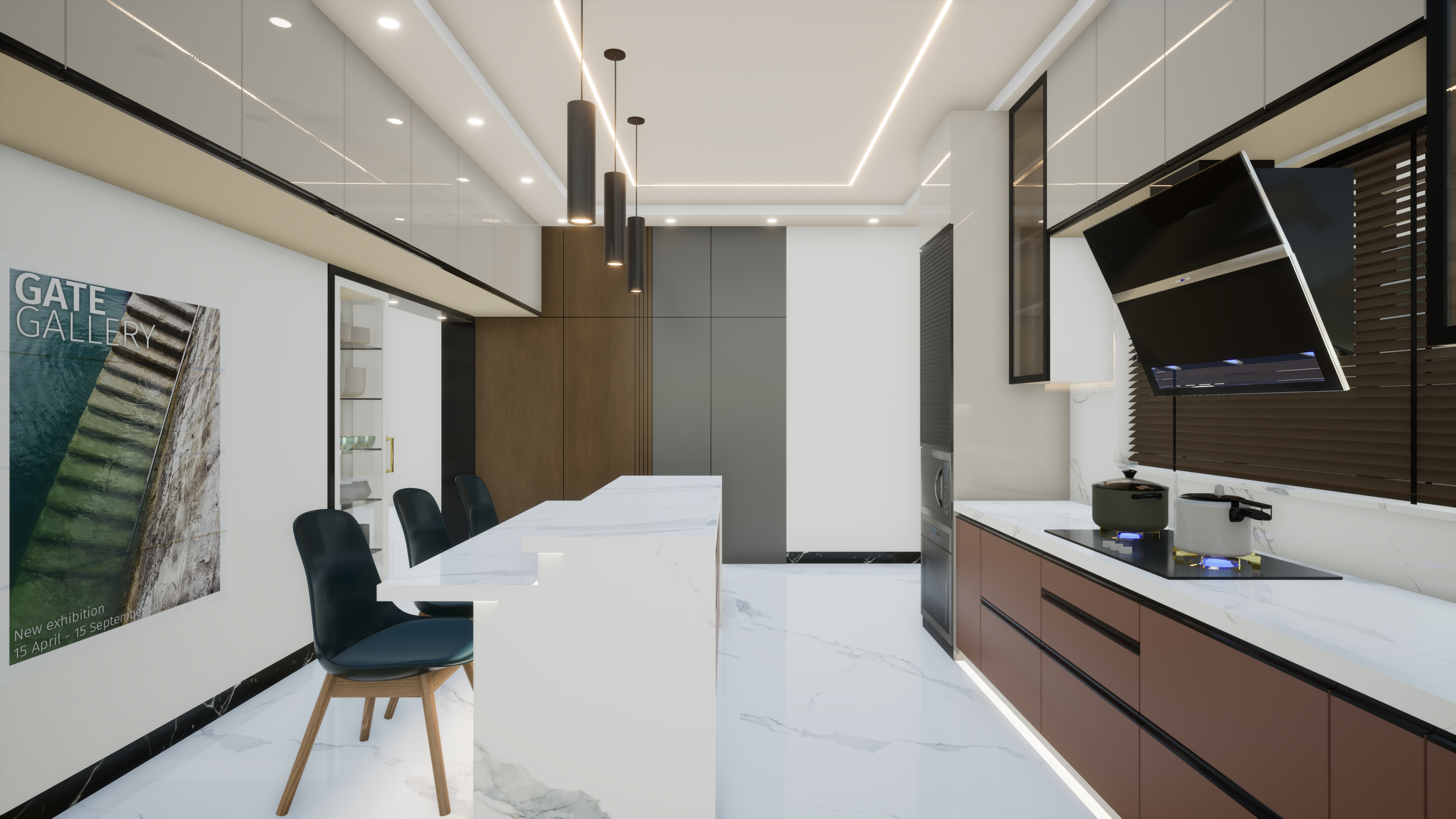 A realistic 3D render of a luxury kitchen space, highlighting the sophisticated layout, custom cabinetry, and high-end appliances. This visualization provides an immersive design experience, showcasing material textures and lighting interplay.